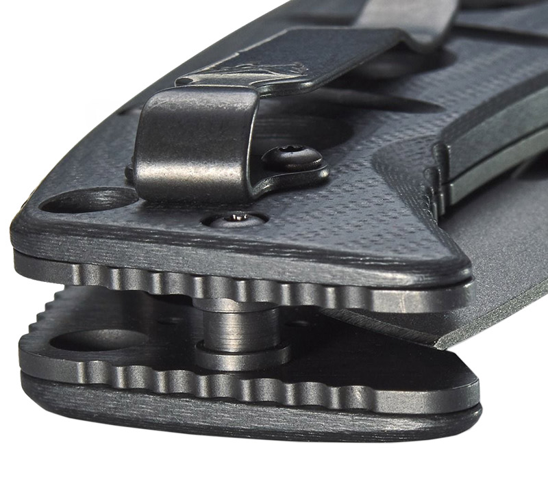 Die schwarzen G10-Griffschalen mit strukturierter Oberfläche sorgen für exzellenten Grip und Kontrolle – auch unter extremen Bedingungen. Sie sind auf stabilen Stahl-Linern montiert und tragen zur enormen Robustheit des Messers bei. Für das dezente Tragen in der Tasche steht ein beidseitig montierbarer Deep-Carry-Clip (Tip-Up) zur Verfügung. Besonders durchdacht: Die Fangriemenöse, die geriffelte Daumenauflage sowie das mitgelieferte Nylon-MOLLE-Etui inklusive Malice-Clip – ideal zur Befestigung an taktischer Ausrüstung.