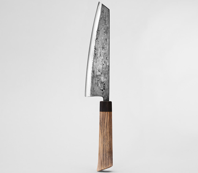 Die 19 cm lange Klinge wird zu 100 % handgeschmiedet und besteht aus recyceltem Carbonstahl, gewonnen aus ausrangierten LKW-Federn. Dadurch entsteht ein Stahl, der besonders elastisch ist und zugleich eine enorme Schärfe ermöglicht. Die Schneide wird beidseitig im 15°-Winkel geschliffen, wodurch präzise, saubere Schnitte fast mühelos ausgeführt werden.