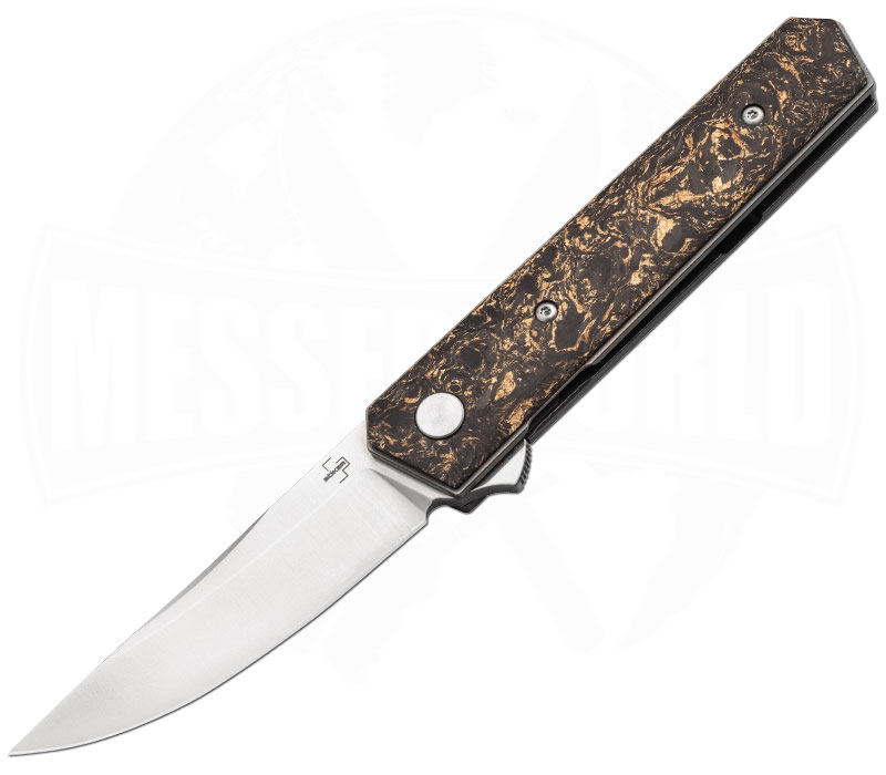Dass Lucas Burnley ein absolutes Genie und ein Virtuose der Messerkunst ist, steht wohl außer Frage. Er beweist das in Zusammenarbeit mit Böker Plus ein aufs andere Mal. Mit dem Kwaiken Compact Flipper Marble Carbon Copper schließt er an die Erfolgsreihe Kwaiken an und überzeugt hier mit einem unglaublichen Design. Sofort fällt die Farbpracht des Messers ins Auge, die mit dem gold-schwarzen Erscheinungsbild verzaubert. Doch kann das Messer nicht nur Optik - die weichen und angenehmen Griffschalen aus kupferhaltiger Kohlefaser im Kontrast zu der festen Titanrückseite des Hefts geben eine noch nie erlebte Handhabung. Fein in das Titan gearbeitet, befindet sich ein Frame-Lock, der die Klinge sicher und zuverlässig hält. Schnell verliebt man sich in die butterweiche Bedienung des Messers, die der kugelgelagerten Klingenachse und dem kompakten Flipper zu verdanken ist. Die überaus scharfe und ansprechend geformte Klinge aus M390 High-End-Stahl ist 7,6 cm lang und hat eine Klingenstärke von 3,2 mm. Eine Fangriemenöse sowie ein praktischer Deep-Carry-Clip runden die Ausstattung des edlen Gentleman-Messers ab und bieten eine tolle Tragemöglichkeit. Geliefert wird das streng auf gerade einmal 200 Modelle limitierte Messer in einem Nylon-Etui. Sicher dir jetzt deins bevor es zu spät ist!