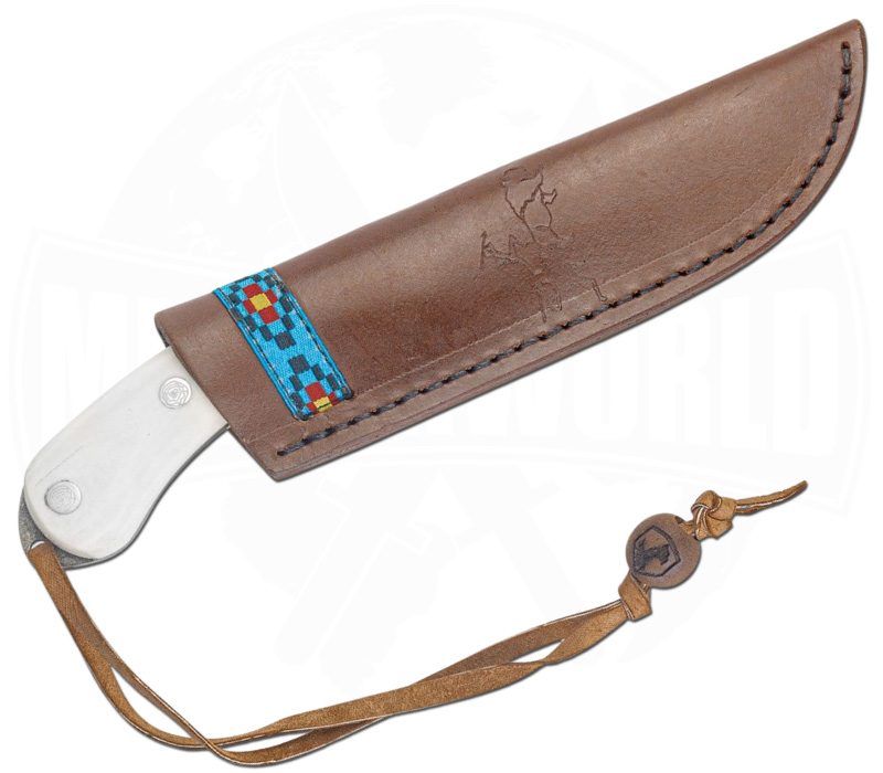 Der weiße Micarta-Griff mit dem eingesetzten türkisfarbenen Ornament erinnert an den handgefertigten Schmuck nordamerikanischer Ureinwohner. Diese Kombination aus Ästhetik und Funktionalität verleiht dem Messer seine unverwechselbare Identität – elegant, natürlich und zugleich kraftvoll.