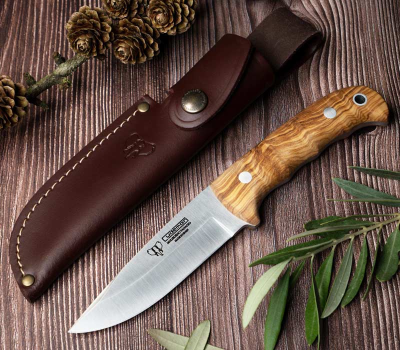 Mit dem Hunting bringt Cudeman ein schönes Jagdmesser auf den Markt, welches mit schlankem Design und rustikalem Aussehen so manchen Outdoorbegeisterten überzeugen sollte. Die 11 cm lange Clippoint-Klinge besteht aus dem sehr stabilen Molybdän-Vanadium Stahl, wodurch sie leicht zu schärfen und sehr bruchsicher ist. Dadurch kann man das Messer auch mal etwas härter anpacken, ohne Angst vor Klingenausbrüchen haben zu müssen. Dank der Fehlschärfe ist die Spitze sehr fein, was gerade beim Zerlegen von Wild ein großer Vorteil ist. Die Griffschalen aus Olivenholz liegen, vor allem wegen der Fingermulden und den abgerundeten Kanten, ausgezeichnet in der Hand und ermöglichen ein ermüdungsfreies Arbeiten auch über einen längeren Zeitraum. Mit im Lieferumfang enthalten ist eine Lederscheide aus braunem Leder. Eine Öse am Griffende ermöglicht das Anbringen eines Fangriemens.