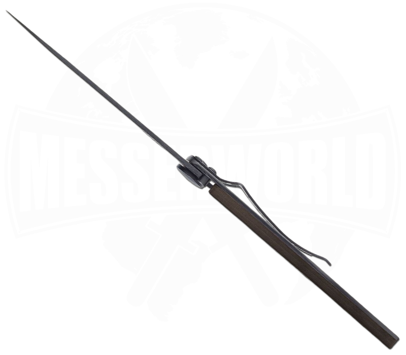 Dieses Modell verzichtet bewusst auf ein dekoratives Klingenmuster – die schwarz beschichtete Klinge bleibt klar und glatt, was den puristischen Charakter unterstreicht. So rückt die Materialwahl und die Form noch stärker in den Fokus: clean & funktional.