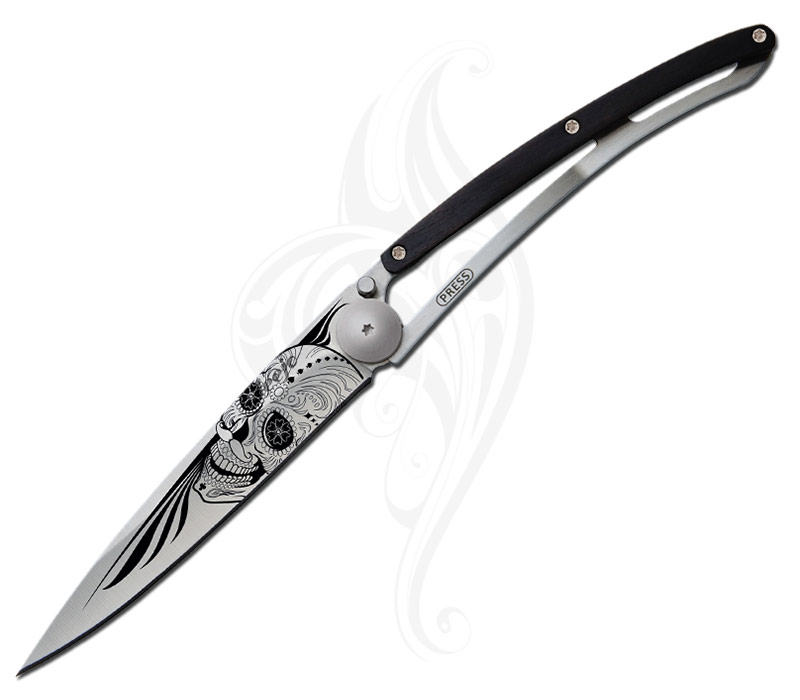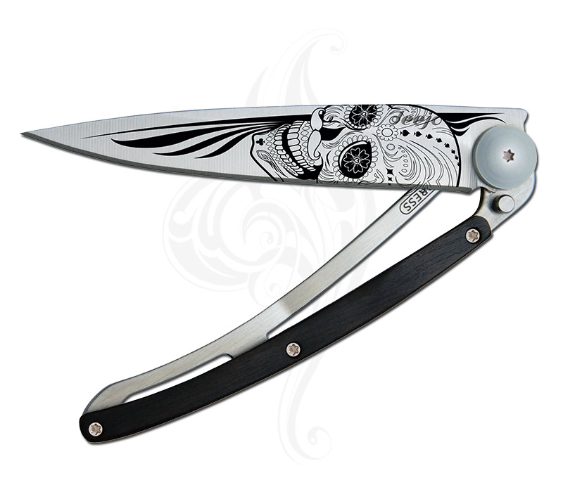 Deejo 37g Tattoo Latino Skull Ebenholz – ultraleichtes EDC-Taschenmesser mit Tattoo-Skull-Gravur