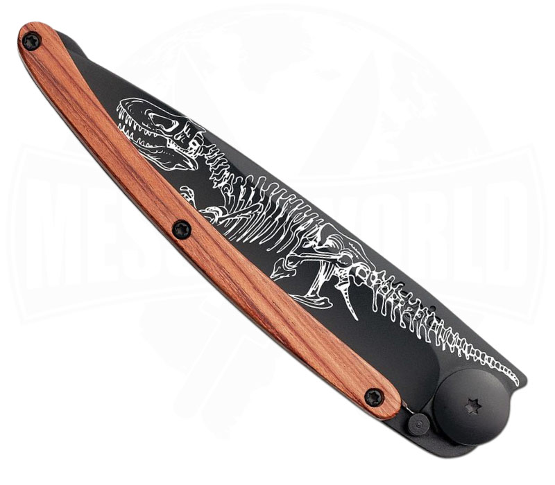 Markante T‑Rex‑Gravur – kraftvolles Motiverlebnis auf der Klinge.