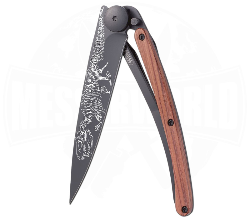 Das Deejo 37g Tattoo T‑Rex Korallenholz katapultiert dich in vergangene Zeiten – digital, ikonisch und mit ordentlich Power auf der Klinge. Die Gravur zeigt einen dynamischen Skelett Tyrannosaurus Rex in voller Aktion, bereit, aus dem Stahl zu springen. Dieses Motiv steht für Mut, Stärke und Unerschütterlichkeit, und verleiht dem Messer eine visuelle Präsenz, die du nicht so schnell vergisst.