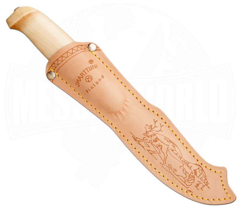 Die Lederscheide des Marttiini Lynx 129 ist mit feinen, lappländischen Mustern verziert – eine Hommage an die kulturelle Geschichte Finnlands. Sie schützt das Messer zuverlässig und kann bequem am Gürtel getragen werden. So ist das Lynx 129 immer griffbereit – ob beim Wandern, Jagen oder Campen.