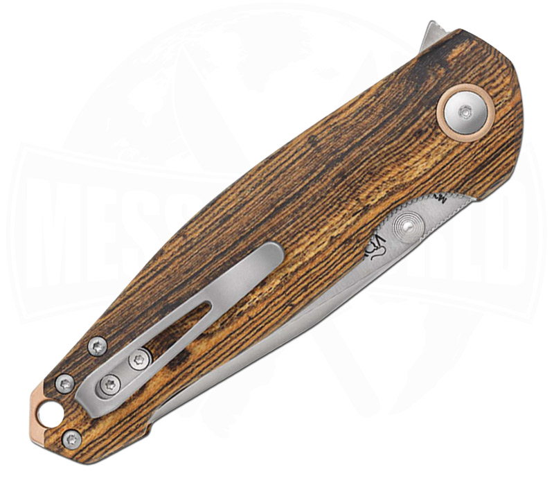 Der Griff aus Bocoteholz setzt ein Statement: markante Maserung, warme Haptik und ein außergewöhnlicher Look. Zusammen mit dem präzise gefrästen Backspacer samt Fangriemenöse entsteht ein harmonisches Zusammenspiel aus Eleganz und Outdoor-Tauglichkeit. Das Messer wirkt edel, bleibt aber im Kern kompromisslos funktional.
