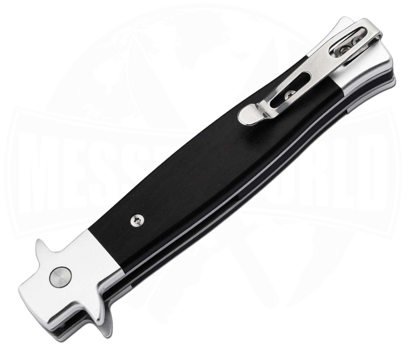 Die verschraubten Ebenholz-Griffschalen verleihen dem Automatikmesser eine warme, edle Ausstrahlung. Edelstahl-Backen und das Parier-Element sorgen für Stabilität sowie eine harmonische Balance zwischen Design und Funktion.