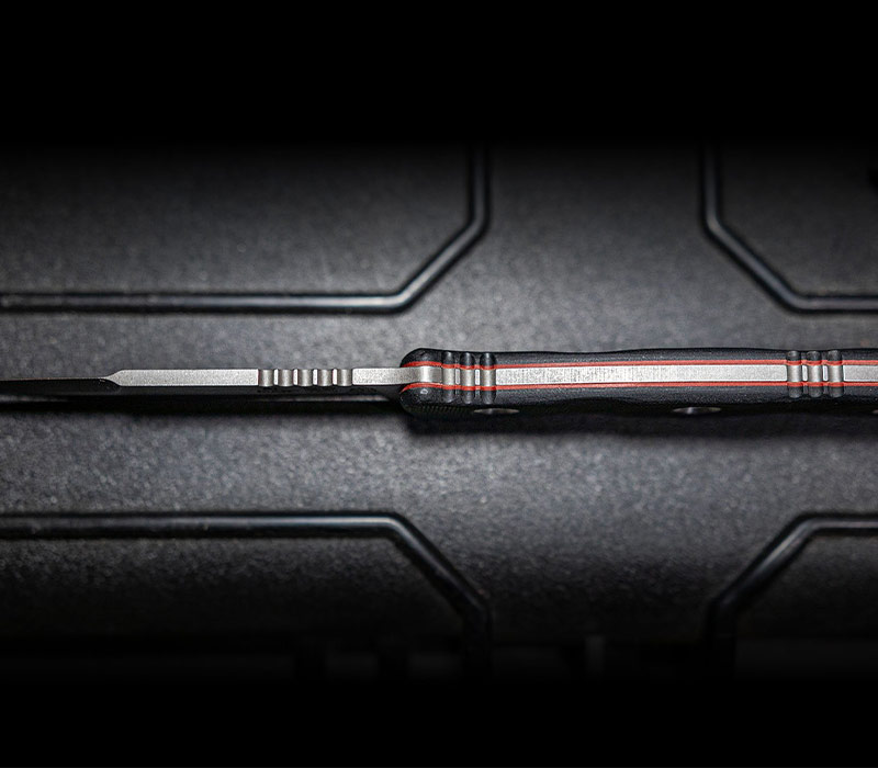Der ergonomische Griff aus schwarzem G10 mit roten Akzenten ist schlank gehalten und dennoch äußerst griffig. Strukturierte Rillen sorgen für sicheren Halt – auch bei Nässe oder unter Stressbedingungen. Vorwärts- und Reverse-Grip lassen sich gleichermaßen kontrolliert führen.