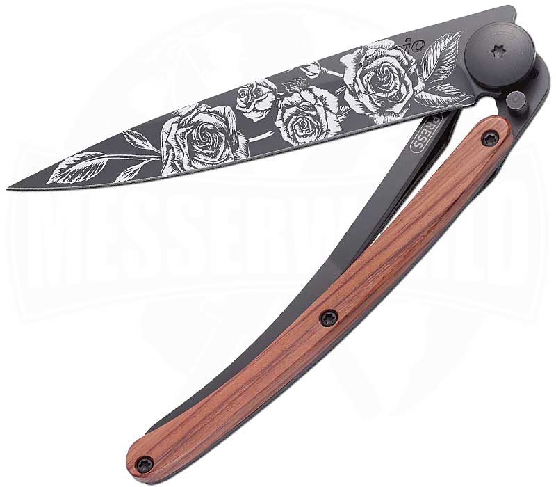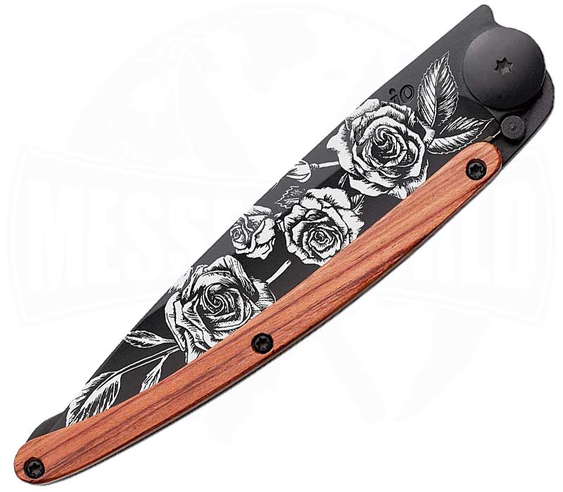 ▶ Die Deejo 37g-Serie gilt international als Referenz für ultraleichte Design-Taschenmesser. Mit dem Tattoo Rosen Modell wird diese Linie um eine besonders elegante, florale Variante ergänzt, die Ästhetik und Alltagstauglichkeit auf höchstem Niveau kombiniert.