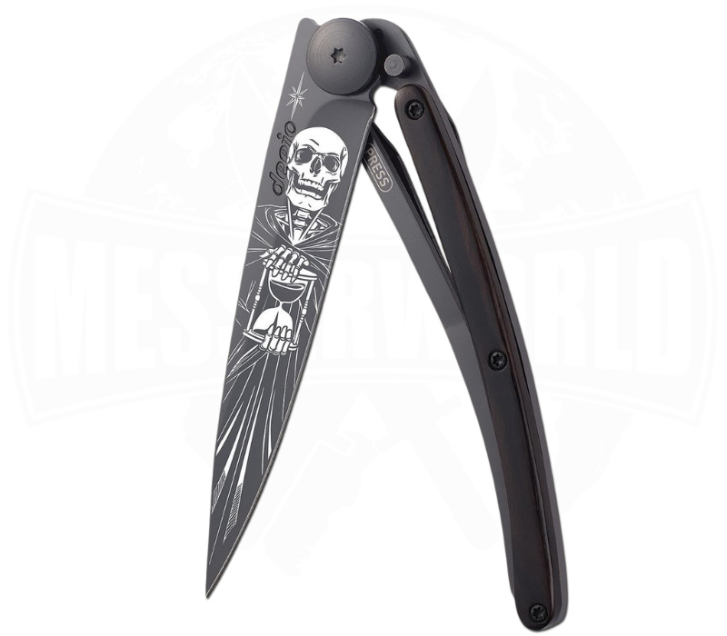 Das Deejo Tattoo Unsterblich 37g Ebenholz fängt die Idee von Beständigkeit und Stärke in einem kleinen, eleganten Taschenmesser ein. Die feingravierte Tattoo-Klinge zeigt das Motiv „Unsterblich“ – Zu sehen ist ein Skelett mit schwarzem Gewand und einer großen Sanduhr in der Hand.