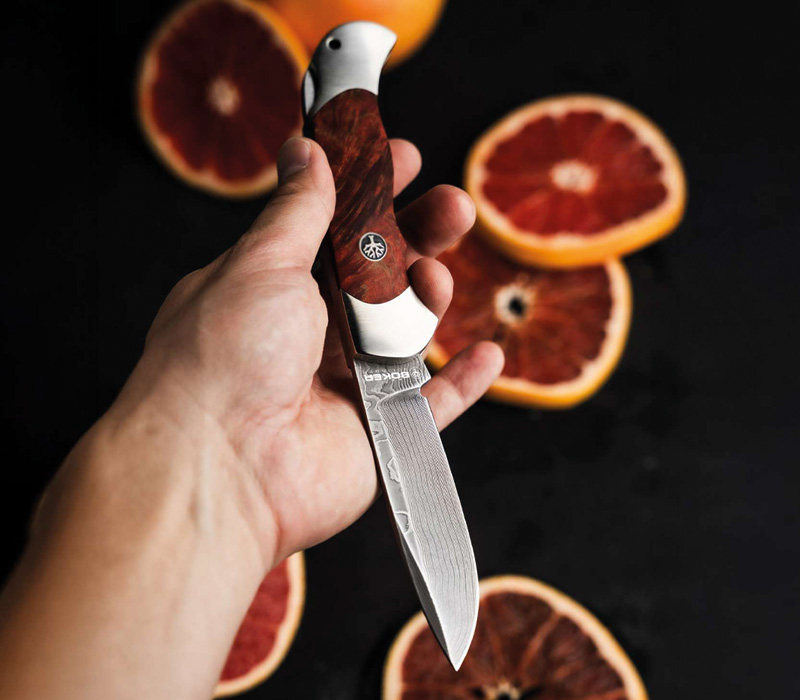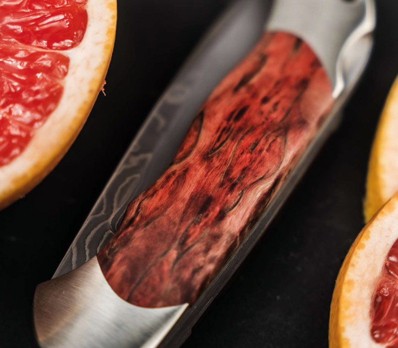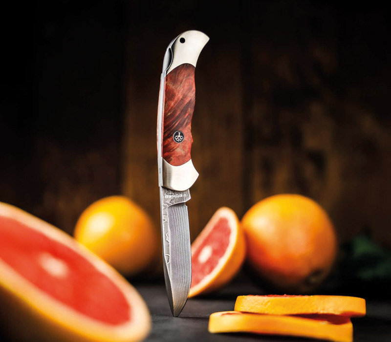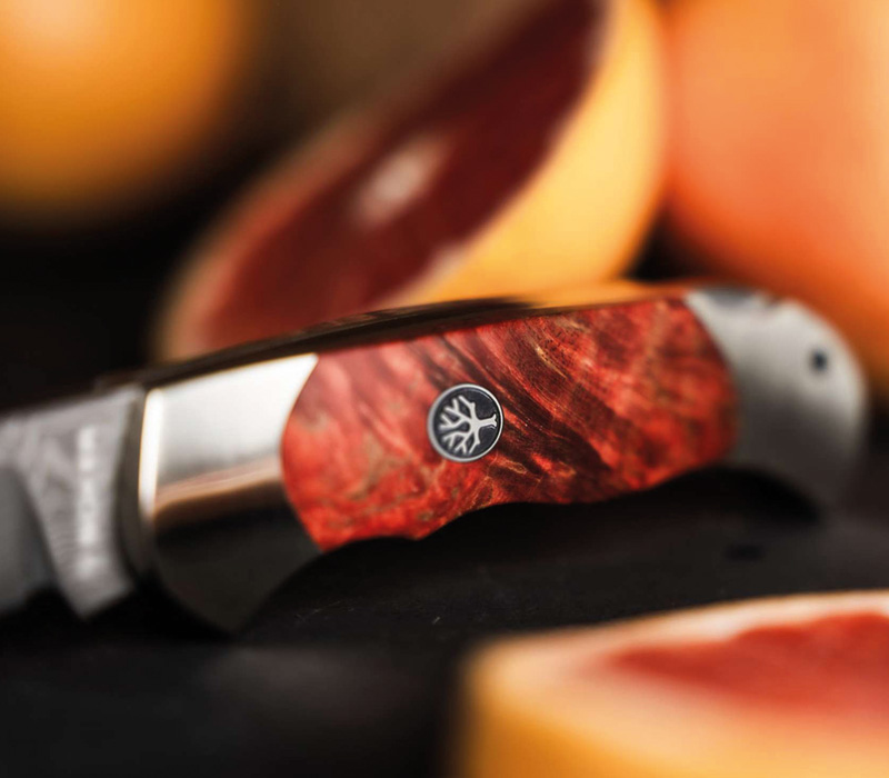 Der edle Griff aus gesintertem Neusilber wird mit stabilisiertem Maserbirkenholz in intensivem Rot-Orange kombiniert. Diese Farbgebung sorgt nicht nur für einen einzigartigen Look, sondern steht auch für Langlebigkeit, Stabilität und edle Haptik. Das Zusammenspiel aus Metall und Maserbirke macht jedes Exemplar zu einem kleinen Kunstwerk.