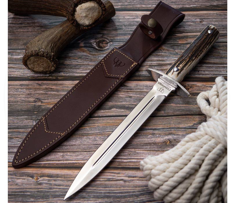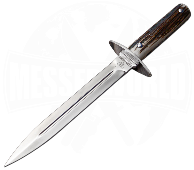 Jedes Exemplar ist durch den handgearbeiteten Hirschhorngriff ein Unikat. Die warme, griffige Haptik und das Parierelement aus Edelstahl sorgen für sicheren Halt und unterstreichen die naturverbundene Eleganz, die dieses Messer zum besonderen Begleiter für Jäger und Sammler macht.
