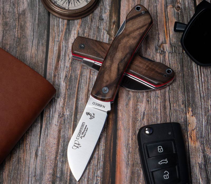 Der Griff aus edlem Nussbaumholz liegt warm und sicher in der Hand. In Kombination mit der satinierten Klinge aus hochwertigem Böhler N690Co-Stahl ergibt sich ein harmonisches, maritimes Gesamtbild. Ob bei Arbeiten an Deck, beim Angeln oder als stilvolles Alltagsmesser – das Marinera Wood überzeugt durch Eleganz und Funktionalität.