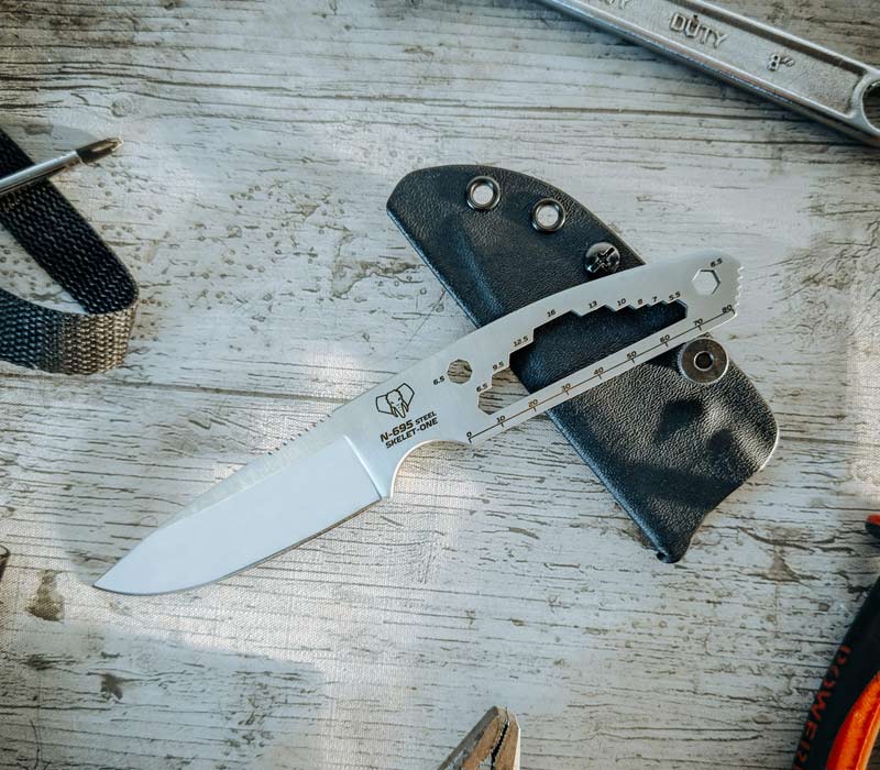 Der Stahlgriff ist nicht nur besonders robust, sondern beherbergt auch praktische Funktionen: Gabelschlüssel in den Größen 6,5 / 9,5 / 12,5 / 16 / 13 / 10 / 8 / 7 / 5,5 mm sowie Sechskant- und Achtkantschlüssel (6,5 mm). Damit ist das Skelet-One weit mehr als ein Messer – es ist ein nützliches Werkzeug für Outdoor-Aktivitäten, Picknicks oder kleine Reparaturen im Alltag.