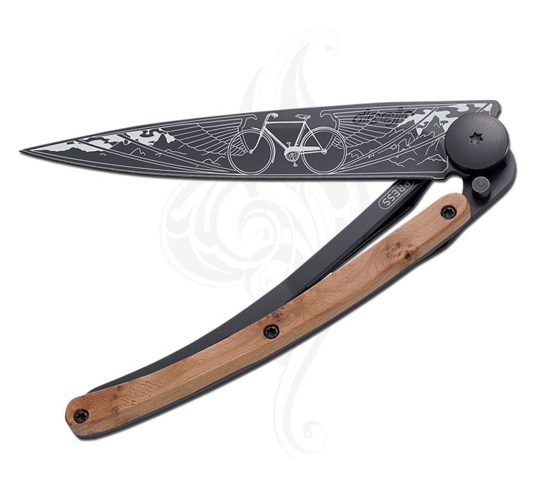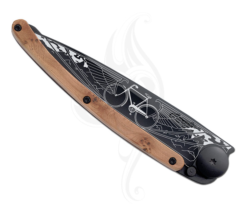 Deejo 37g Tattoo Fahrrad Wacholderholz – ultraleichtes EDC‑Taschenmesser mit Fahrrad‑Gravur