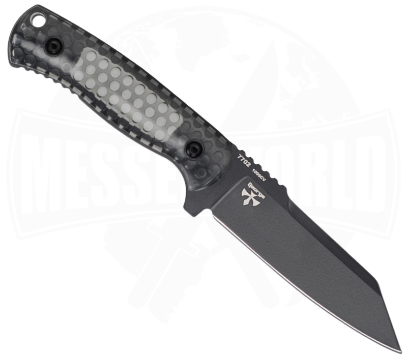 Der Griff aus widerstandsfähigem Polycarbonat ist nicht nur optisch ein Statement, sondern überzeugt auch funktional. Er liegt sicher in der Hand, bietet gute Kontrolle und ist gleichzeitig extrem robust und wetterbeständig. Mit einer Grifflänge von 12 cm und einer ausgewogenen Gesamtgeometrie fühlt sich das Messer jederzeit kontrolliert und souverän an.