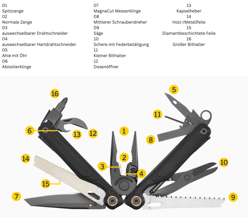 Mit 16 integrierten Tools liefert das Wave Alpha alles, was du brauchst – vom Drahtschneider über Feilen und Schere bis zum Schraubendreher mit Bitaufnahme. Alle Werkzeuge sind leicht zugänglich, präzise verarbeitet und auf maximale Haltbarkeit ausgelegt. Dieses Multitool ist für alle, die keine halben Sachen machen – ob im Beruf, beim Camping oder im Alltag.