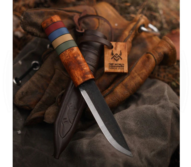 Das Design basiert auf dem über 1000 Jahre alten Wikinger-Messer, das einst für Entdecker und Krieger geschaffen wurde. Bei der WWC 2025 Edition trifft dieses historische Erbe auf moderne Innovation: Der Griff aus Maserbirke und original Eleiko-Gummi erinnert an die ikonischen Gewichtheberplatten, die in jeder Profihalle der Welt zu finden sind.