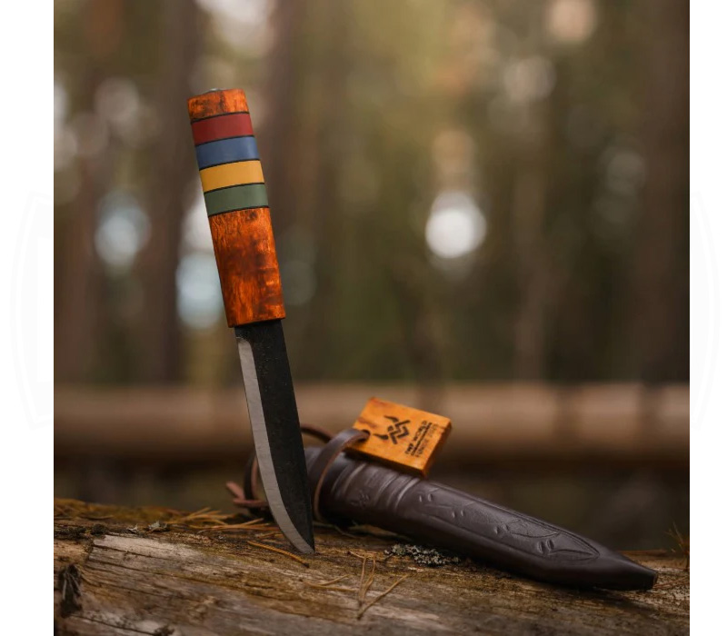 Die kräftige 11 cm lange Drop-Point-Klinge aus dreifach laminiertem Carbonstahl bietet unübertroffene Stabilität und Schnitthaltigkeit. Ihr schwarzes Finish – direkt aus der Wärmebehandlung – verleiht dem Messer eine rustikale, authentische Note. Der durchgehende Erl sorgt für außergewöhnliche Robustheit, während die traditionelle Lederscheide das Gesamtbild perfekt abrundet.