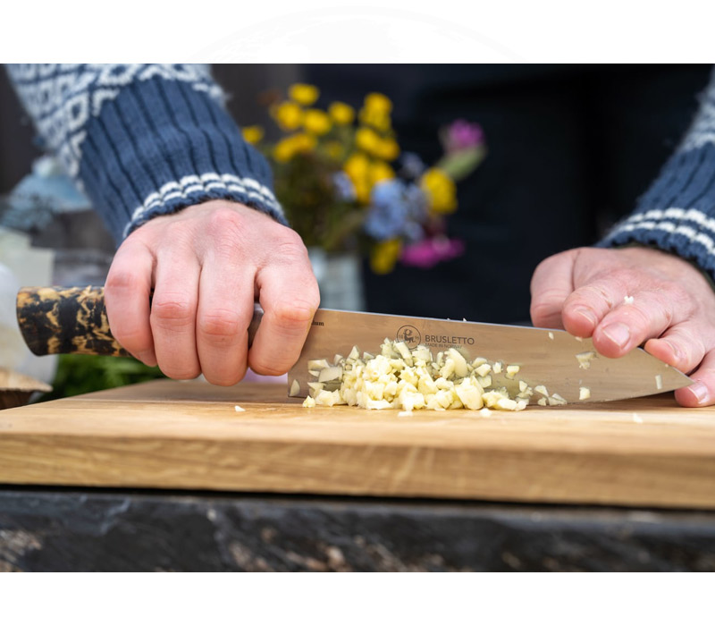Die rasiermesserscharfe Klinge ist dünn ausgeschliffen und ideal für das Vorbereiten verschiedenster Zutaten – von Gemüse über Fisch bis hin zu Fleisch. Der ergonomische Griff aus gefärbter Maserbirke orientiert sich am legendären Design des Brusletto Hunter, das seit Jahrzehnten für zuverlässige Kontrolle und Komfort steht.