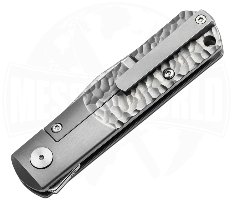 Der präzisionsgefertigte Titangriff greift das kosmische Thema konsequent auf. Die Kombination aus klassischer Barlow-Form mit überlanger Backe und einer unregelmäßigen, meteoriteninspirierten Textur im hinteren Griffbereich sorgt für eine außergewöhnliche Optik und eine angenehme Haptik. Der integrierte Frame-Lock mit gehärtetem Lockbar-Insert garantiert höchste Sicherheit im täglichen Gebrauch.