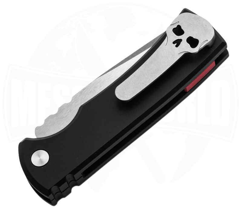 Typisch für Ramon Chaves ist der markante Skull Clip aus Titan, inspiriert von der mexikanischen Symbolik der Santa Muerte. Ergänzt wird das Design durch einen chiliroten Backspacer mit integrierter Fangriemenöse – ein stilvoller Kontrast, der das Messer optisch abrundet.