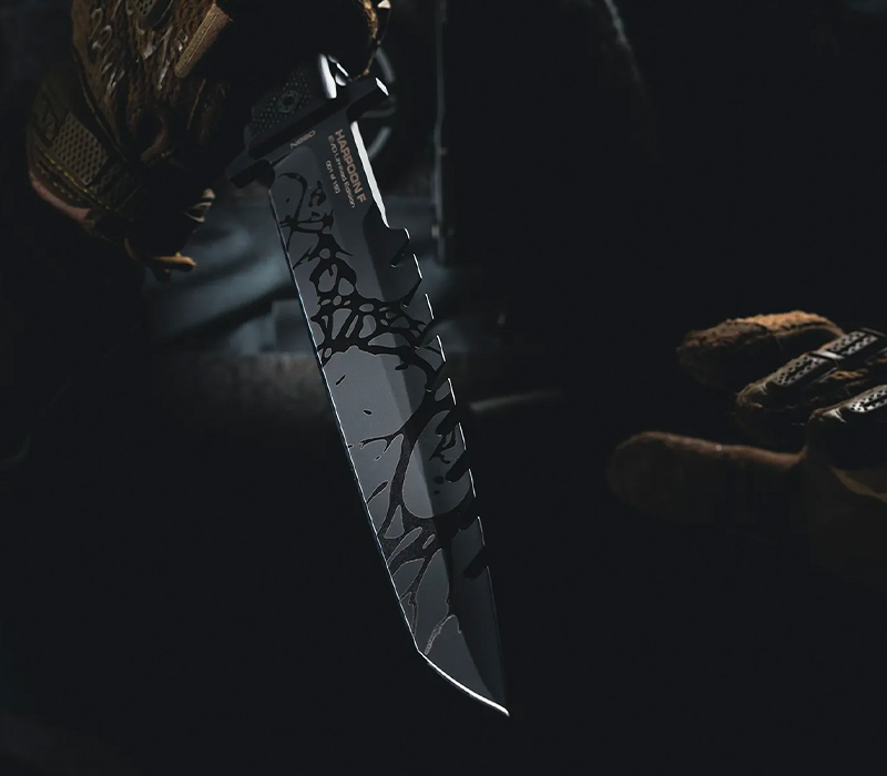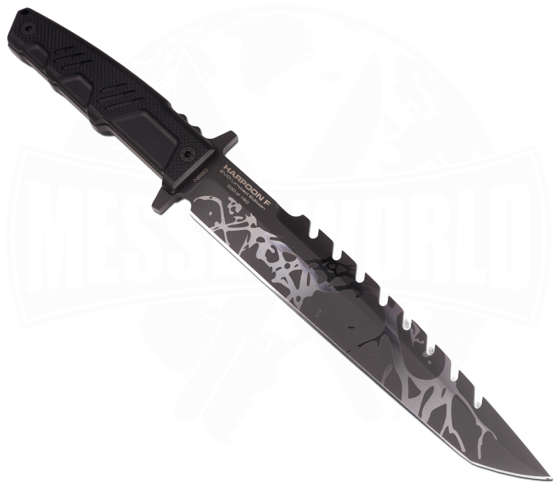 Die Klinge aus Böhler N690 Stahl (58 HRC), 6,3 mm dick, behält den ikonischen modifizierten Spear-Point bei, ist jedoch durch ein optimiertes Tapered-Profil leichter, schneidfreudiger und perfekt ausbalanciert. Die funktionale Verzahnung auf dem Rücken erlaubt die Nutzung als Harpoon auf einem Stock.