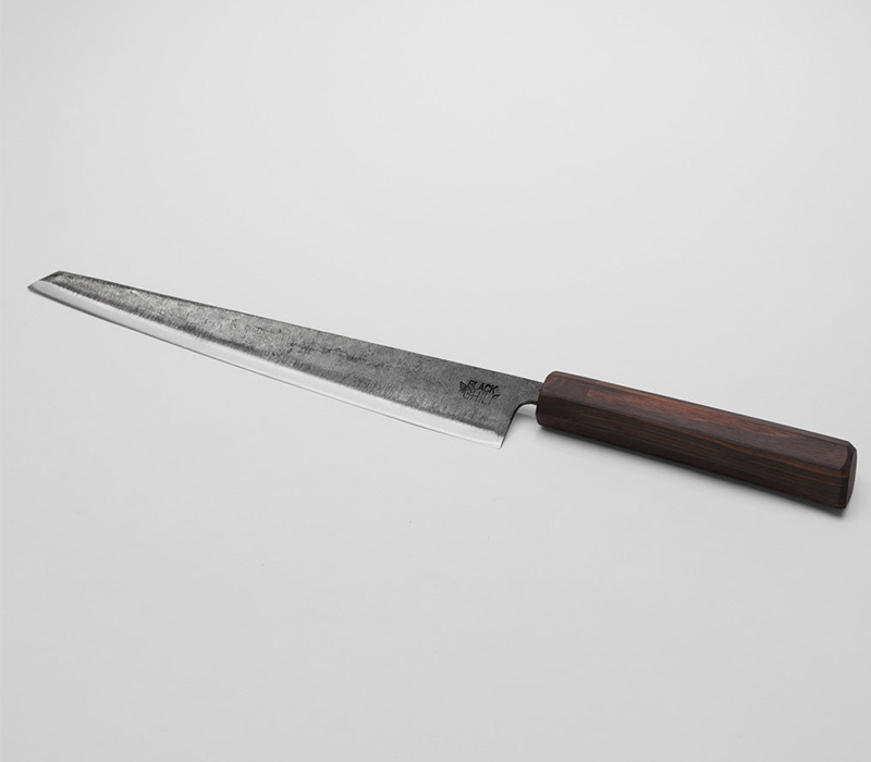 Die Griffe bestehen aus gemasertem Ebenholz mit Kragen aus tiefschwarzem Kernholz. Dadurch wird eine optimale Balance zwischen Klinge und Griff erreicht. Gleichzeitig überzeugt Ebenholz durch hohe Dichte, Wasserresistenz und außergewöhnliche Haltbarkeit. Eine spezielle Oberflächenbehandlung schützt das Holz langfristig.