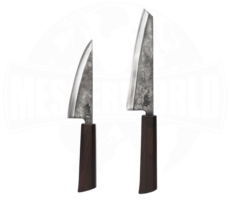Beide Klingen werden vollständig handgeschmiedet aus recycelten LKW-Federn. Der verwendete Carbonstahl enthält geringe Siliziumanteile, die die Elastizität erhöhen und die Schneide stabil halten. Das Ergebnis ist eine außergewöhnlich scharfe, langlebige Klinge mit hervorragender Nachschärfbarkeit.