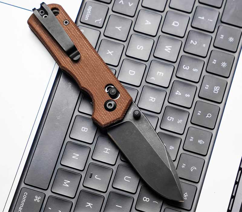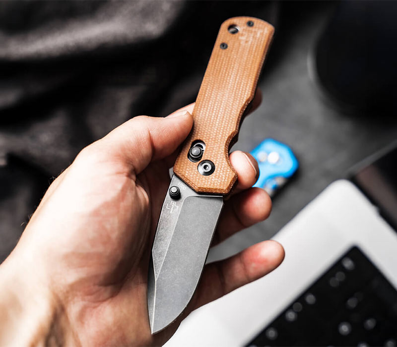 Der Griff aus braunem Micarta liegt perfekt in der Hand, bietet exzellenten Grip selbst bei Feuchtigkeit und sorgt für eine sichere Handlage bei allen Anwendungen. Die integrierte Fangriemenöse ermöglicht die Befestigung von Lanyards und unterstreicht den praktischen, EDC-tauglichen Charakter dieses kompakten Taschenmessers.