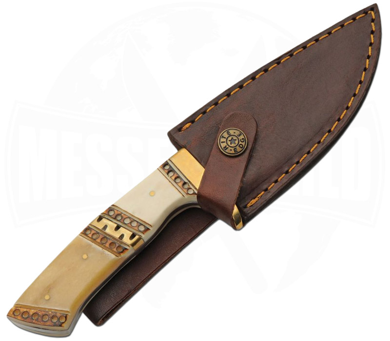 Der Griff aus Knochen wird durch einen Messing-Guard ergänzt, wodurch eine elegante und zugleich rustikale Anmutung entsteht. Dadurch wird der traditionelle Charakter unterstrichen, während ein sicherer Handschutz gewährleistet bleibt. In der Hand liegt das Messer ausgewogen und kontrollierbar.