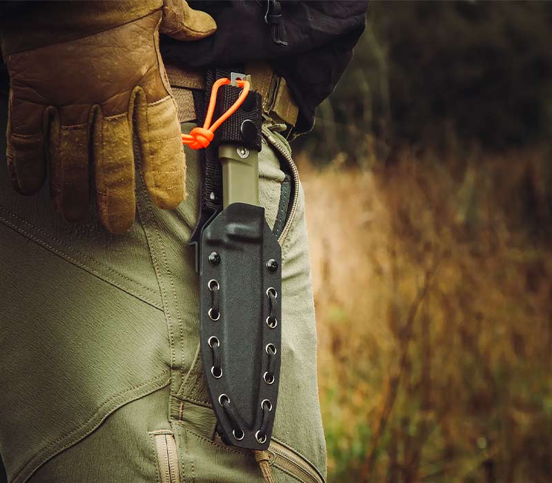 Dank modularer Befestigungsmöglichkeiten kann das Messer flexibel getragen werden – am Gürtel, am Rucksack oder an modularer Outdoor-Ausrüstung. So passt sich das System deinen Anforderungen an.