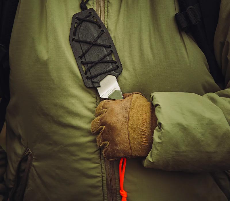 Das Messer bleibt sicher fixiert. Gleichzeitig ist es jederzeit schnell griffbereit – ob am Gürtel oder an der Ausrüstung befestigt.