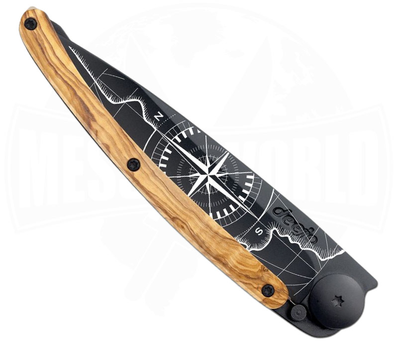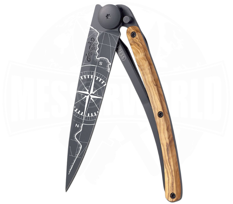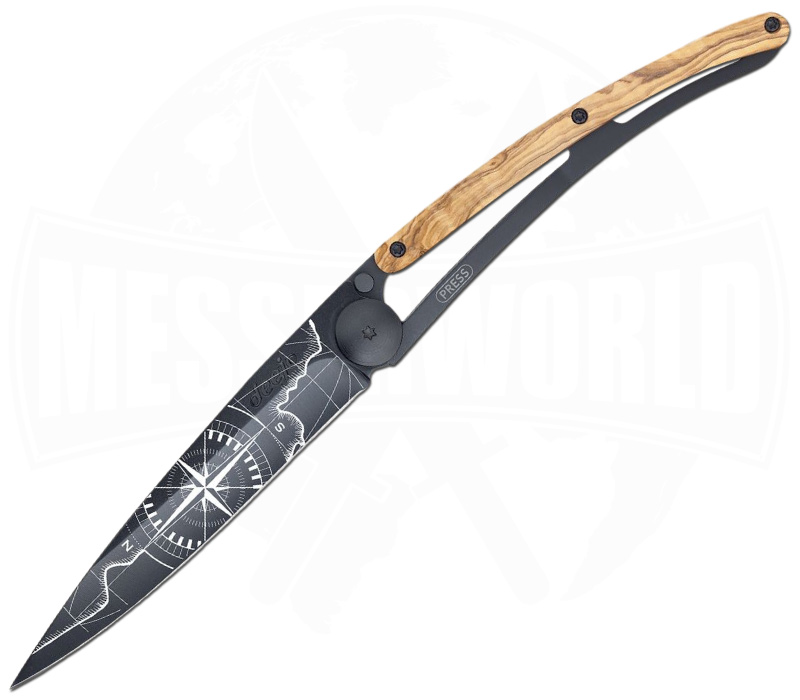 Deejo 37g Tattoo Terra Incognita Black Olivenholz – ultraleichtes EDC-Taschenmesser für Abenteurer und Entdecker