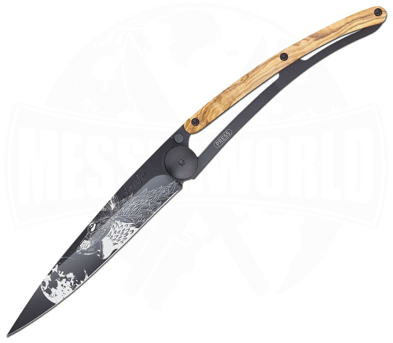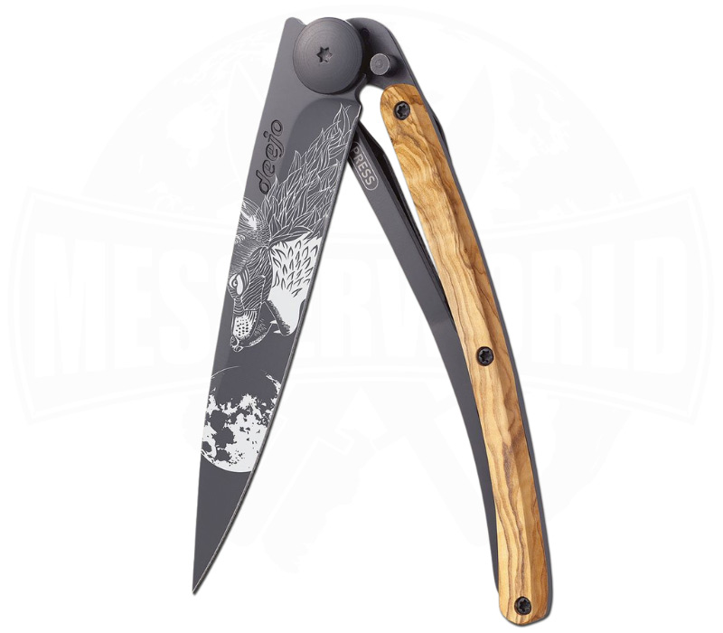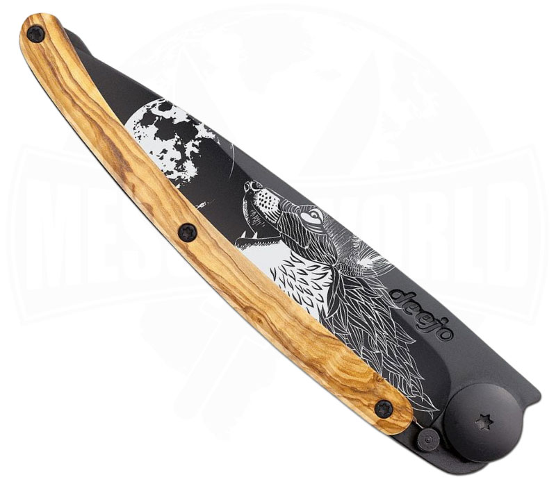Deejo 37g Tattoo Schrei Olivenholz – ultraleichtes EDC-Taschenmesser mit Wolfs-Gravur
