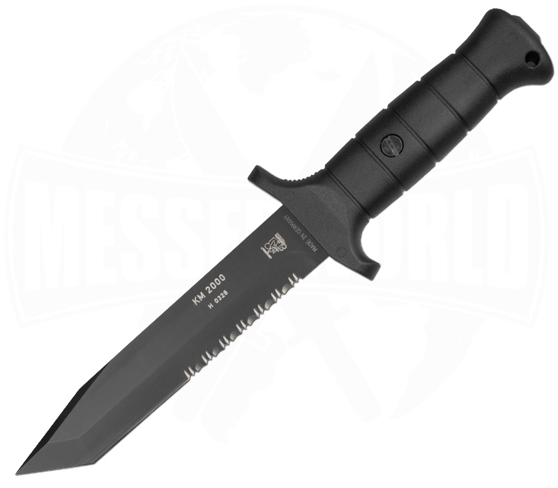 The classic from the German company Eickhorn: THE KM2000. Probably the Bundeswehr's most popular tactical knife, and rightly so! The Böhler steel blade is a proud 17 cm long. It has a combi-grind or partial serration, so there is a smooth cutting edge and one with serration to be able to cut through materials such as paracord and climbing ropes reliably and quickly. The N695 blade steel has a black coating and can withstand some stress. The blade of the knife is enclosed by the fibreglass-reinforced plastic handle and protrudes slightly from the back of the handle to serve as a glass breaker or pressure point amplifier. Thanks to the double guard, your hands are adequately protected at all times when working and the handling is also flawless. The KM2000 also shines in the bushcraft sector with its properties. In addition to cutting and sawing, it can also be used for batoning, i.e. splitting wood. So we have a real all-rounder here!