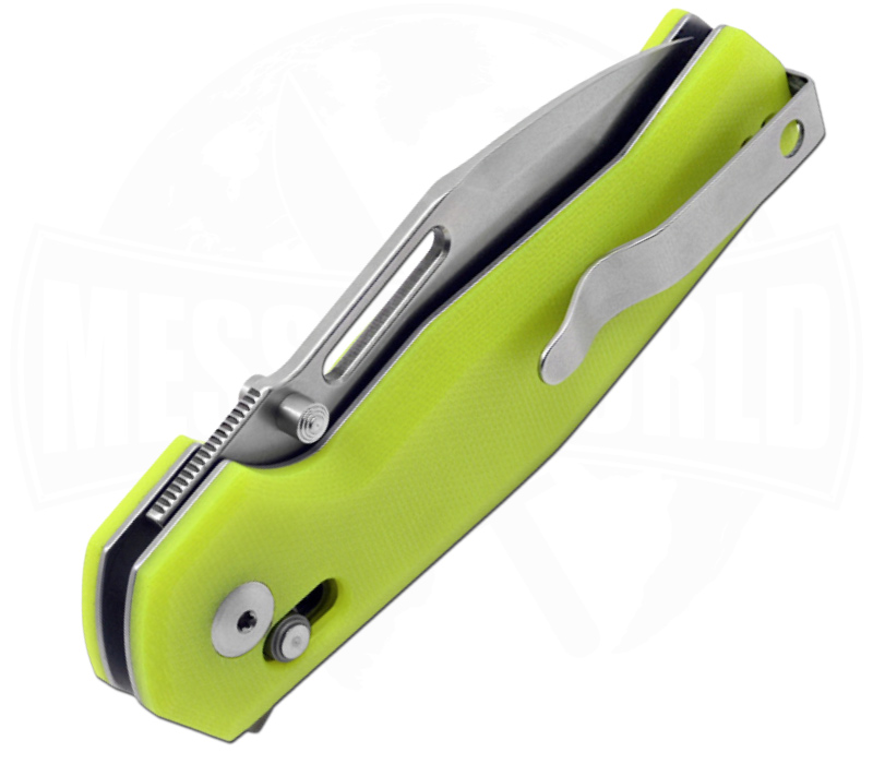 Der ergonomische G-10 Griff in Neon Gelb liegt komfortabel in der Hand und garantiert Langlebigkeit. Die Fangriemenöse erweitert die Tragemöglichkeiten zusätzlich, während der Tip-up Pocketclip rechts schnellen Zugriff im Alltag ermöglicht.