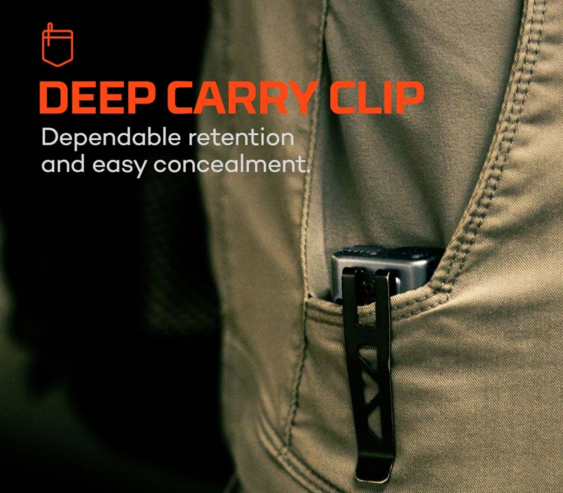 Das taktische Design der NEBO Edge 2K überzeugt mit einer rutschfesten Tac-Grip™-Textur für sicheren Halt in jeder Situation. Ein stabiler Taschenclip aus Stahl sorgt für eine bequeme Befestigung an Gürtel, Tasche oder Ausrüstung. Die Lampe ist wasser- und stoßfest nach IPX6 und besteht aus widerstandsfähigem, eloxiertem Aluminium in Flugzeugqualität – robust genug für den harten Alltagseinsatz.