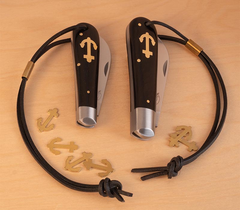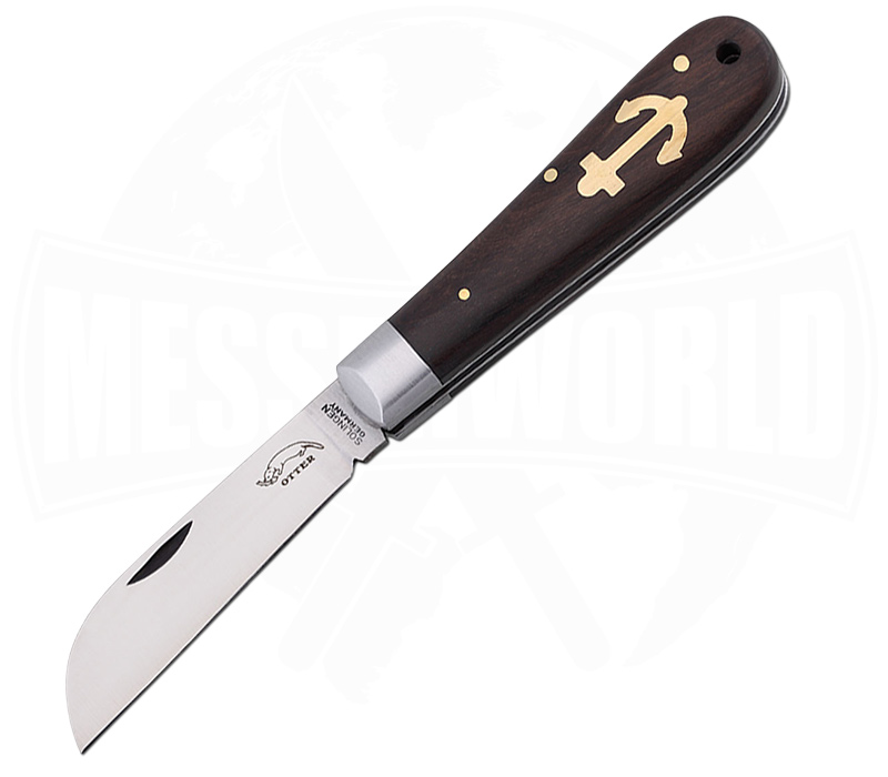 The Otter Anchor Knife II Grenadilla is the larger version of the classic anchor knife. Typical for this one is the brass anchor embedded in the handle, which is a beautiful decorative element, as well as the practical horseshoe blade. Together with the silver-colored bolsters and the dark grenadilla wood, the result is a contrasting composition of elegant materials. In true classic fashion, this knife is pinned instead of screwed. There is a hole at the end of the handle for a lanyard. The blade shape, which is very similar to the well-known Wharncliffe shape, offers a very straight edge and is ideal for pulling cuts. The blade is held in the open position by a slipjoint spring. The non-stainless blade achieves incredible sharpness and holds it for a long time.
