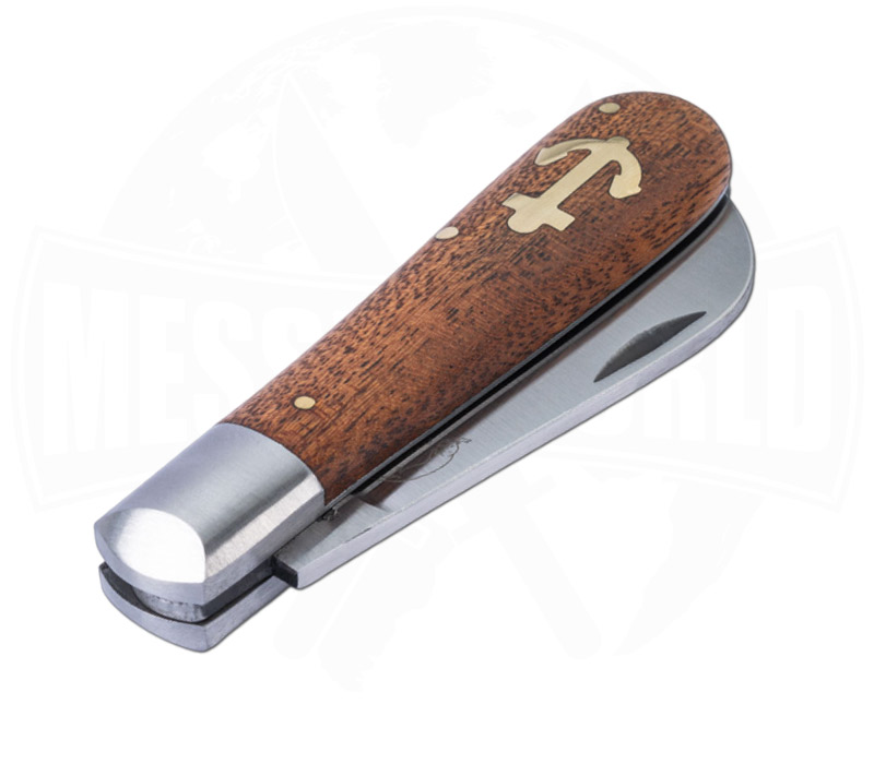 Der Griff aus edlem Sapeli-Holz überzeugt durch seinen warmen, rötlichen Farbton und seine feine Maserung. In das Holz ist ein Messinganker eingelassen, der dem Messer seine unverwechselbare maritime Note verleiht. Gemeinsam mit den Stahlbacken entsteht ein harmonischer Kontrast, der Tradition und Eleganz vereint.