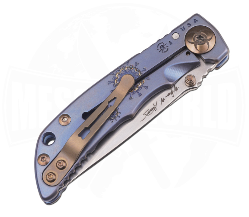 The 8.3 cm long drop point blade is made from high-performance CPM MagnaCut steel and achieves a hardness of 59–61 HRC. It offers excellent edge retention, corrosion resistance, and stability—ideal for everyday use or as a high-quality collector's item. The flat grind and stonewashed finish ensure universal cutting performance and a striking appearance. The real highlight is the 6AL-4V titanium handle scales, which feature a matte black coating and an intricate engraving of the “Plague Doctor.” The golden motif gives the knife a mystical depth and underlines the exclusive character of the Black Plague Edition. The design is rounded off by a golden pivot screw engraved with the biohazard symbol and screws and clip insert in gold-bronze tone.