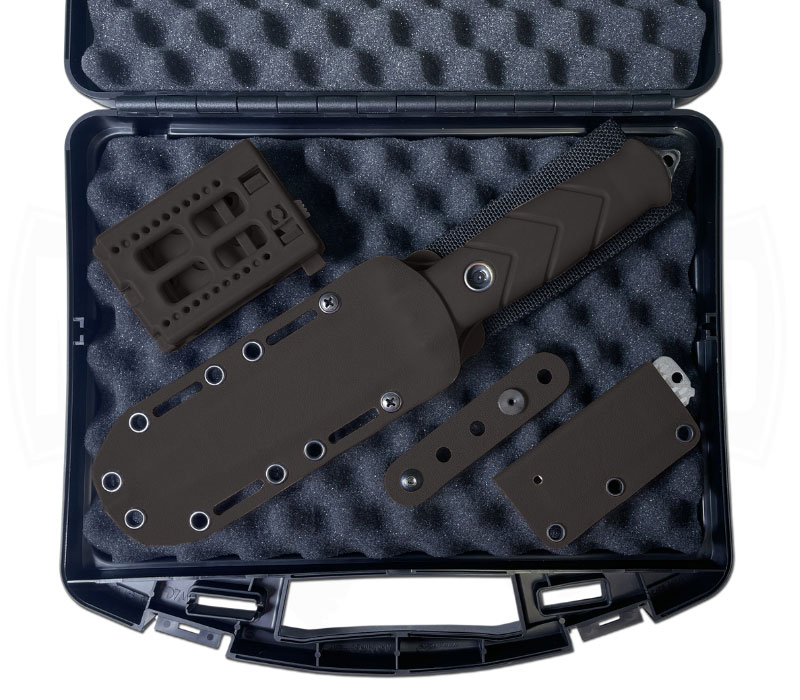 Geliefert wird das Messer in einem stoßfesten Koffer inklusive Kydex-Holster, MOLLE-kompatiblem Gürtelsystem, Feuerstahl, Diamantschärfer, Teklok-Adapter und praktischem Clip für schnelle Montage – perfekt für taktische Einsätze oder Outdoor-Abenteuer.
