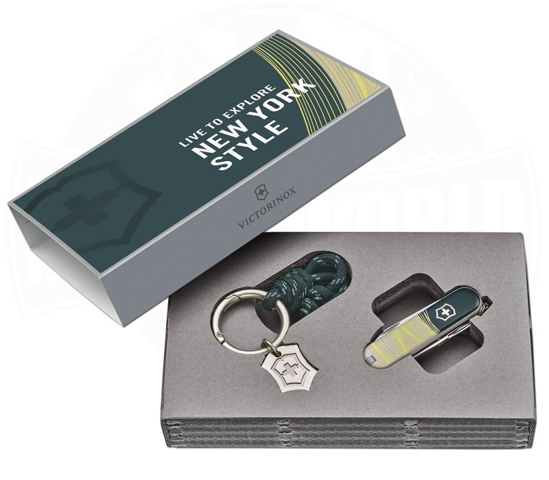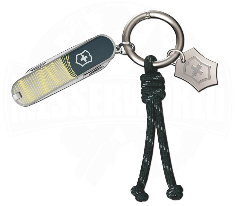 But what exactly does this handy helper have to offer? The ABS/Cellidor handle scales have been given a color combination of black, yellow and silver, giving it a very modern look and reflecting the city that never sleeps. Behind the handle scales hide scissors, nail file, slotted screwdriver, blade, toothpick and tweezers. Also we find a key ring with a paracord and a pendant on which the Victorinox emblem can be seen. The tools can be opened via a nail nick.