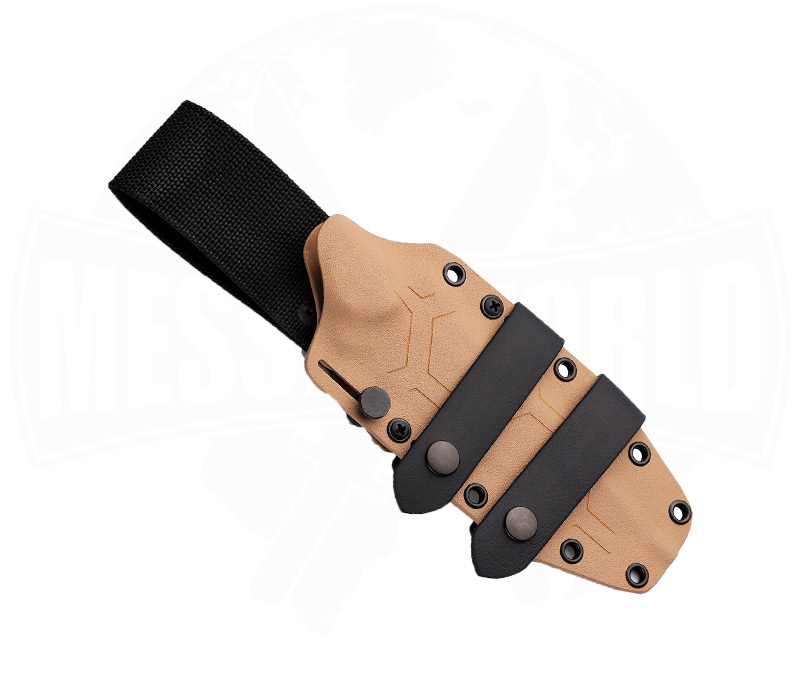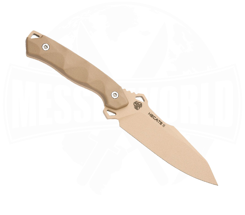 Bei dem Full Tang Messer wurde der beliebte Niolox Stahl verwendet, welcher für seine sehr schneidfreudige und leicht nachzuschärfende Eigenschaft bekannt ist. Mit einer Pulverbeschichtung in Desert Tan bekommt die 12,5 cm lange Klinge einen besonderen Look und wird vor äußeren Einflüssen geschützt. Die ergonomisch geformten Griffe wurden aus CNC gefrästem G10 mit 3D Struktur gefertigt, dieser bietet dem Hecate II eine enorme Griffigkeit selbst bei der Nutzung mit nassen Händen oder Handschuhen. Das Messer kommt mit einer Kydexscheide die mit einem Gürtelschlaufenadapter und einer weichen Gummischlaufe kombiniert wurde, um das horizontale als auch vertikales Tragen zu ermöglichen.