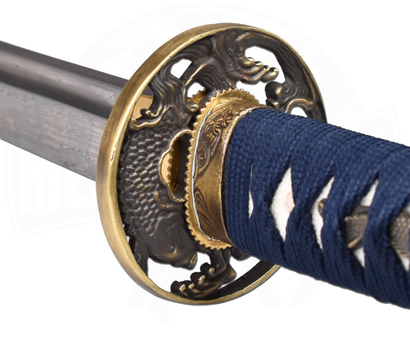 Der Griff ist traditionell aufgebaut und mit echter Rochenhaut unterlegt. Die blaue Baumwollwicklung im klassischen Hineri-Maki-Stil sorgt für sicheren Halt und ein authentisches Handling. Die lange Angel ist mit zwei Bambusstiften (Mekugi) fixiert, wodurch das Schwert vollständig zerlegbar ist. Auf Kunststoff wird konsequent verzichtet – hier kommen ausschließlich hochwertige, traditionelle Materialien zum Einsatz.