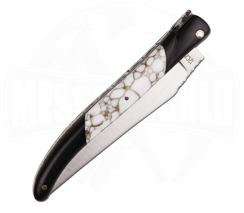 Die Ebony Howlite Gold Edition ist ein Paradebeispiel für französische Handwerkskunst. Jede Komponente – vom edlen Ebenholzgriff über die Goldeinlagen bis hin zur aufwendig gearbeiteten Rückenfeder – wird in minutiöser Handarbeit vollendet. Das Resultat ist ein Messer, das nicht nur als EDC-Taschenmesser überzeugt, sondern auch Sammler und Liebhaber edler Accessoires begeistert.