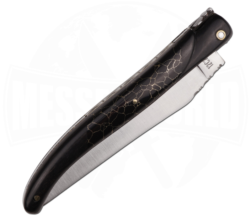Onyx ist ein Edelstein, der für seine tiefschwarze, glänzende Farbe bekannt ist. In Kombination mit den goldenen Inlays entsteht ein besonders stilvoller und zeitloser Look, der diesem Taschenmesser eine luxuriöse Ausstrahlung verleiht. Jedes Stück ist ein exklusives Sammlermesser und spiegelt die Perfektion traditioneller Handwerkskunst wider.