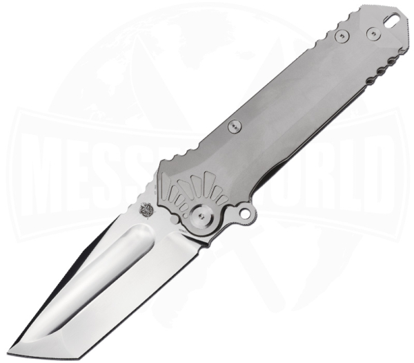Die Griffschalen, der Taschenclip und der Spacer bestehen aus robustem Titan, das für seine Leichtigkeit, Langlebigkeit und exklusive Optik bekannt ist. Das Material sorgt nicht nur für ein angenehmes Handling, sondern macht das Messer auch zu einem stilvollen Begleiter. Mit einem Gewicht von 211,7 Gramm liegt der Bömbur Folder trotz seiner stabilen Bauweise ausgewogen und komfortabel in der Hand.