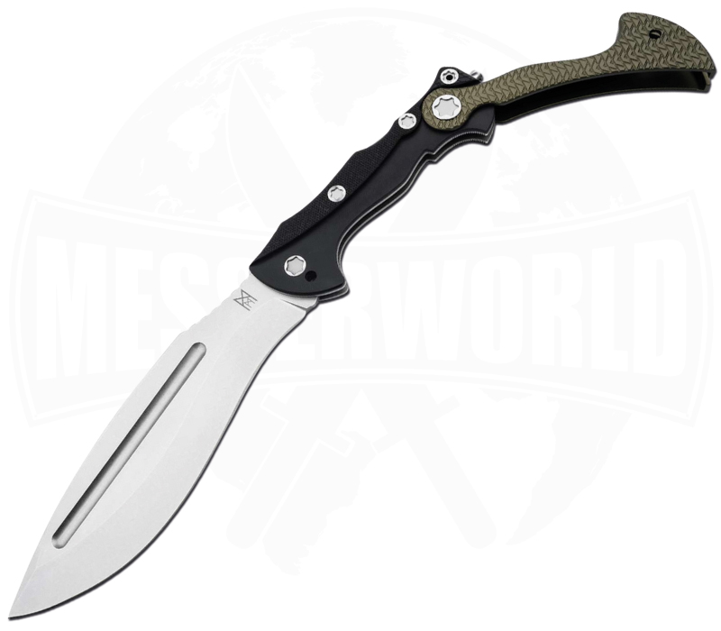 Die charakteristische Kukri-Klingenform aus D2-Stahl sorgt für überragende Schneidleistung und maximale Kontrolle. Durch den einzigartigen Faltmechanismus lässt sich die massive 22 cm Klinge sicher im olivgrünen Aluminiumgriff verstauen. Im geöffneten Zustand rastet das Messer dank Back Lock und Sicherungsstopfen stabil ein – für absolute Sicherheit und Robustheit bei jedem Einsatz.